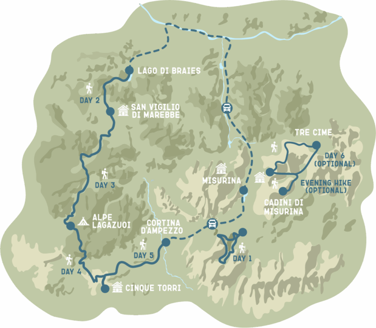 The total distance of just under 85 km is fixed (including the optional hike to the Tre Cime), but the distances for the daily stages may vary based on the availability of the huts.